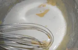 В миску разбить яйца, добавить сахар и соль, взбить венчиком и проссеять в миску муку,добавить 100 мл сливок и хорошо перемешать.