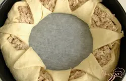 Начинку нужно выкладывать по краю. Завернуть края теста, серединку разрезать на 8 "лепестков", загнуть их от центра к краю.
