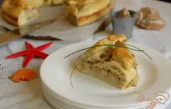 Из остатков теста выдавить рыбок.Выложить их на пирог.Смазать пирог желтком с 1 ч.л. воды. Духовку разогреть до 200 гр, поставить пирог и печь 25-30 минут.