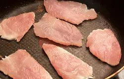 Грудку индейки нарежьте поперек волокон тонкими пластинами (2-4 мм) и быстро обжарьте на сильно разогретой сковороде буквально по 30 секунд с каждой стороны.